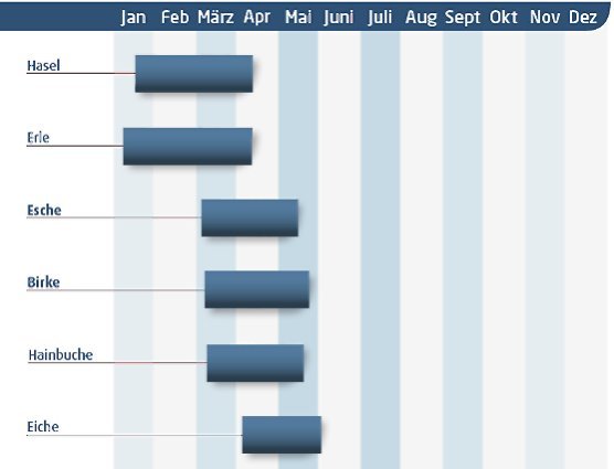 Das Jahr beginnt mit der Baumpollensaison. Baumpollen sind häufige Auslöser einer Pollenallergie. Die meisten Beschwerden verursachen die Birkenpollen. Die sich verändernden klimatischen Bedingungen führen auch dazu, dass frühblühende Bäume wie die Birke, Erle und Hasel nach milden Wintern schon Wochen früher Pollen bilden. Bei manchen Bäumen verlängert sich auch die Blütezeit insgesamt.