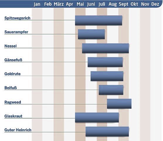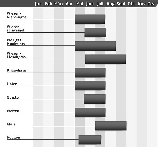 Die Pollensaison für Gräser und Getreide, Wiesenschwingelgras, Roggen, Knäuelgras, Wiesenlieschgras, Weizen, beginnt ca. im April und dauert bis September – mit Spitzenwerten im Mai, Juni und Juli.